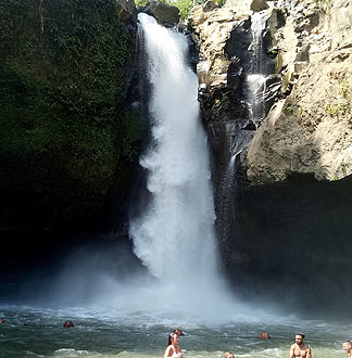 トゥグヌンガンの滝は、ウブドから30分位離れた所にあるプタヌ側の下流にある20mの落差のある滝です。滝への道を行くと、すぐに遠くにこの滝の姿が見え、滝の側まで階段を下りて行きます。側では水しぶきが霧のように降り注ぎますので、タオルは忘れないで下さいね。その後、ゴアガジャ・テガラランでのランチ、ウブド散策とご案内させて頂きます。 |